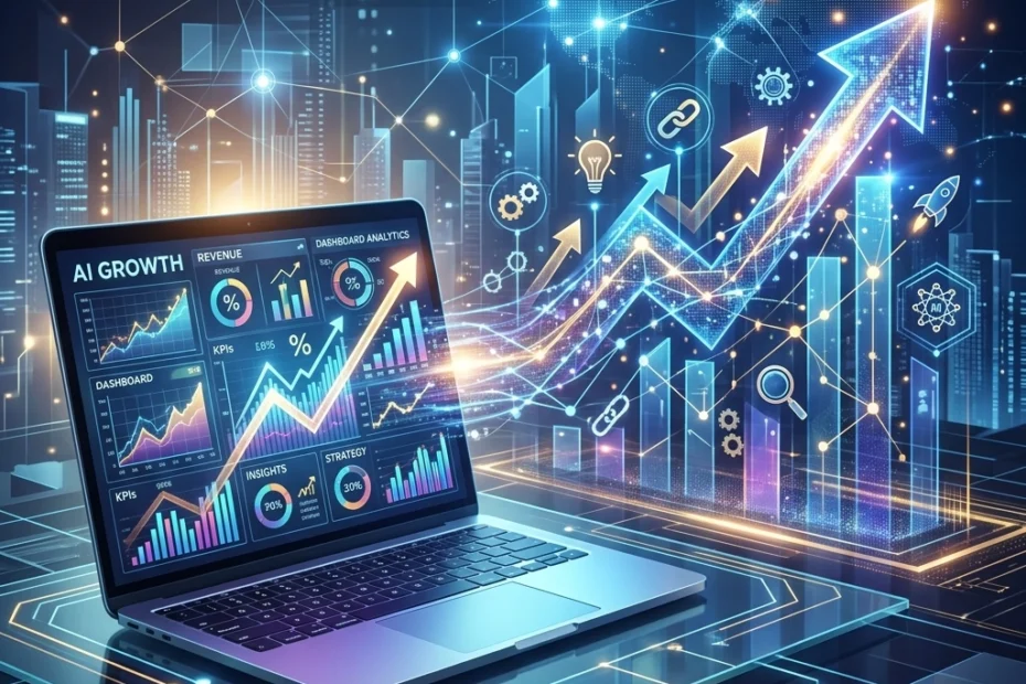 Visual: A dashboard showing AI-driven predictive analytics and business growth charts.